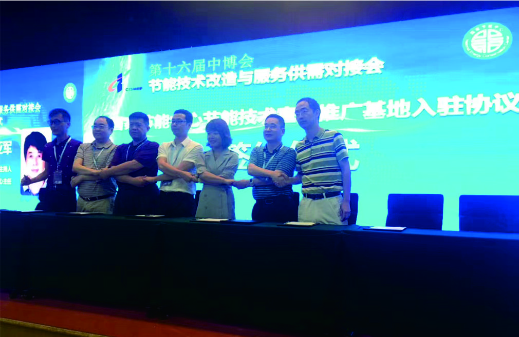 公司董事長(zhǎng)陳程(左二(èr))在第十六屆中博會節能技術改造與服務供需對接會上簽約留(liú)影